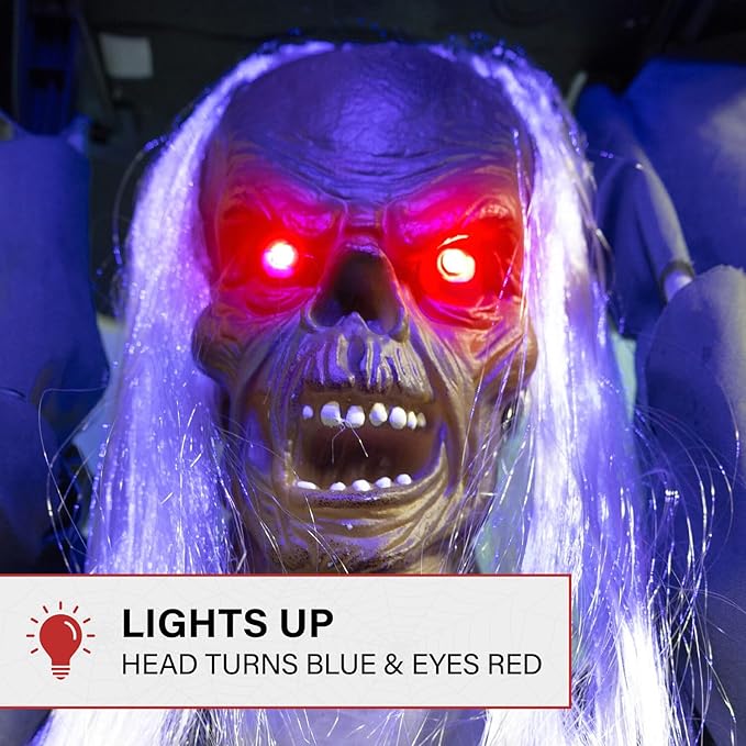 - Lights up: This zombie's eyes light up with a sinister stare in red LEDs while the top of his head lights up blue when activated