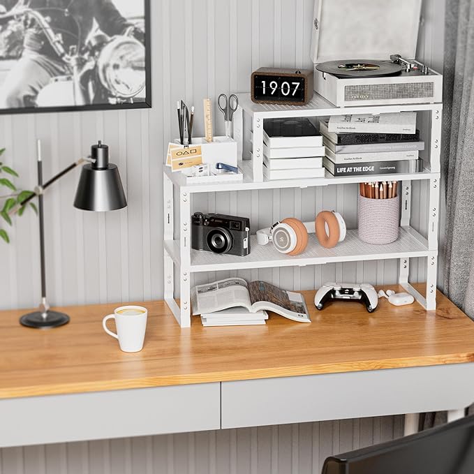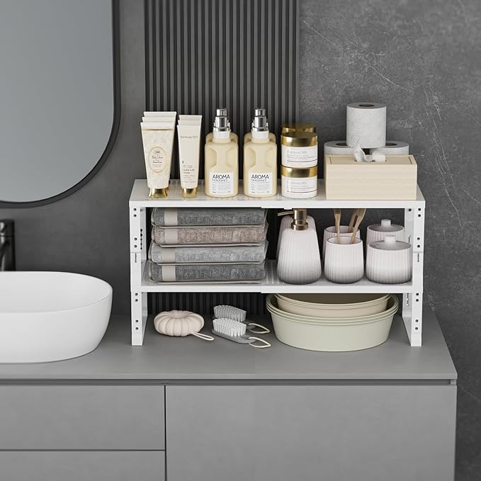 - ⭐【Expandable,Stackable】The shelves can easily expand and contract according to your storage needs, whether it is kitchen clutter or office supplies.You can combine multiple shelves together to form a large storage system, or separate them into several separate smaller units(Measure:8.11"D x 16.54"W~27.17"W x 8.31"H/7.68"H/7.05"H/6.42"H)