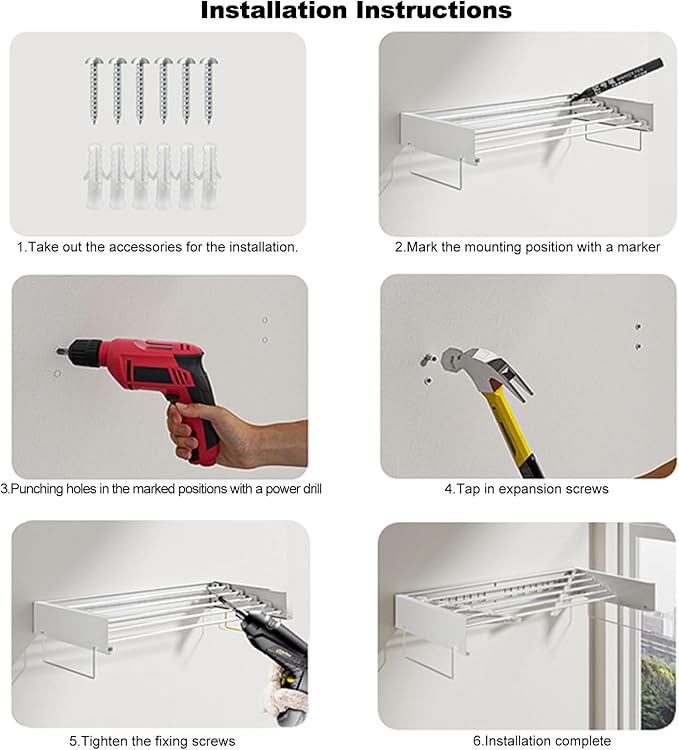 - Easy Installation: The drying rack clothing wall mounted has been pre-assembled in the factory, we are equipped with installation instructions and complete accessories, just simply punch holes and install them on the wall to use. the wall mounted drying racks for laundry convenient to store and easy to assemble, Whether it's clothing, large bedding, blankets, pillows, bed sheets, coats, down jackets, cotton jackets, etc., sweater drying rack can all be easily dried.