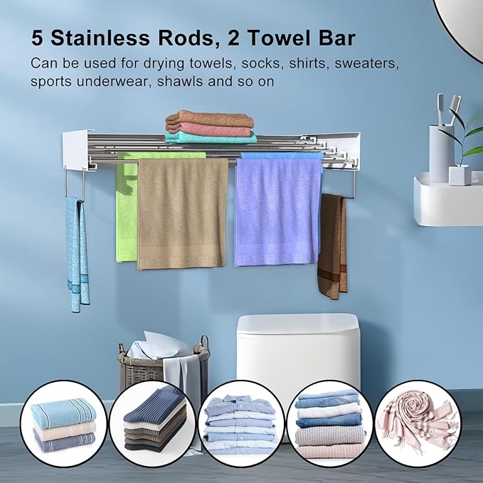Wall Mounted Drying Rack, Foldable Laundry Rack, Collapsible Drying Rack, 5 Stainless Rods, Wall Mounted Clothing Rod with 2 Towel Bar, 90 lb Capacity, 31.5" White