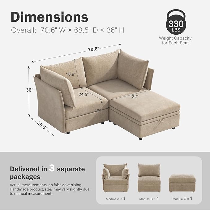 - đź’ˇ Stylish and Spacious Sectional Sofa - A blend of modern elegance and comfort, this beige sofa is ideal for contemporary interiors. Customize seating and shape by adding or removing modules to fit your needs. It's perfect for your living room, family room, bedroom, or office. Overall size: 70.6" W Ă— 68.5" D Ă— 36" H, seat width: 32", seat depth: 24.5".