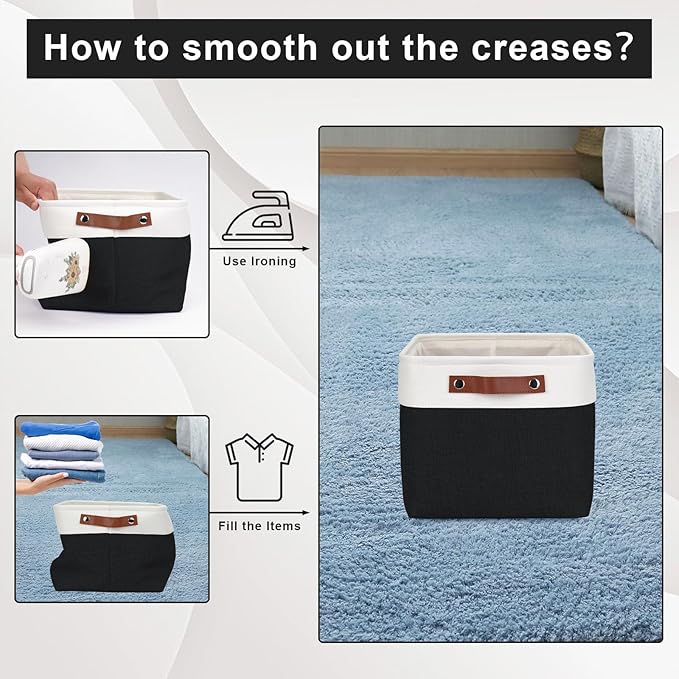 - 【Maintenance & Care Tip】 - Collapsible design for space saving. Our foldable baskets comes in a compression packing which may result in wrinkled storage bin during the long transit. Get rid of the wrinkles by either stuffing the fabric storage bins with blankets and pillows for a few days or steam iron them at low-heat setting. The organization baskets are easy to clean, you can dust the basket with a soft cloth with light soapy water when needed. Not recommended to machine wash.