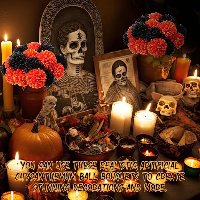 Kimura's Cabin 20Pcs Faux Mums Flowers Fake Chrysanthemum Artificial Silk Ball Flowers for Halloween Garden Home Kitchen Table DIY Decoration Center Fall Bouquets (Orange Black)
