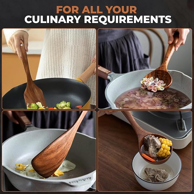 - Premium Teak: Our Wood Utensils for Cooking is crafted from 100% premium teak, renowned for its density, strength, and durability. Teak Wooden Utensil Set is exceptionally resilient and resistant to damage, ensuring a longer lifespan, making it the finest choice in culinary tools. Each piece of our Utensils for Nonstick Cookware is meticulously selected and expertly crafted to guarantee the highest quality standards. Note: Kitchen Utensils may vary in wood grain because of its natural material.