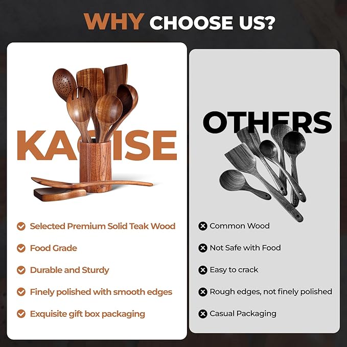 - Durable, Elegant, and Gift-Ready: Teak wood is known for its high density and strength, making these Teak Spoons for Cooking durable and long-lasting. The elegant packaging not only protects the Teak Wooden Utensil Set during shipping but also makes it an ideal gift for friends and family. Whether for personal use or as a thoughtful present, this Cooking Utensils Set is sure to impress. A Thoughtful Mother's Day gift!
