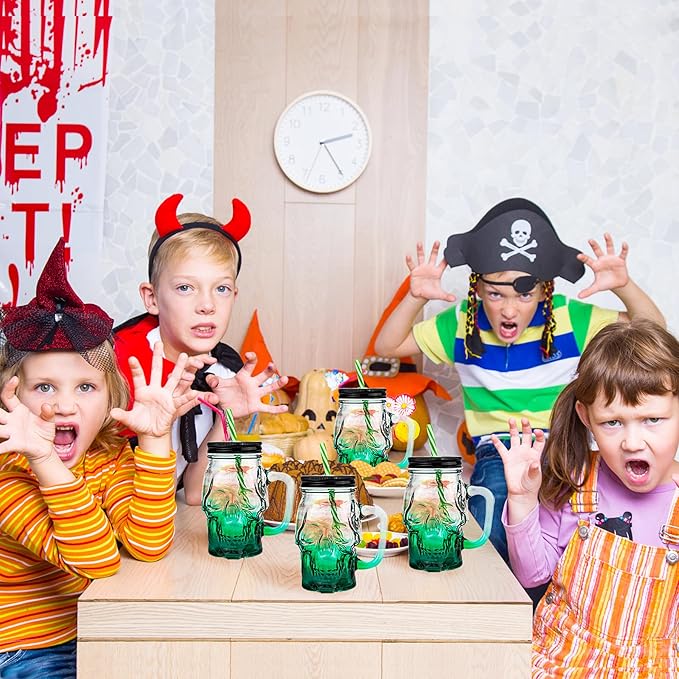 Halloween Cups Set of 4 - Green Skull Glass Drinking Jar with Lids and Straws - Halloween Decor, Drinking Glasses 16 oz