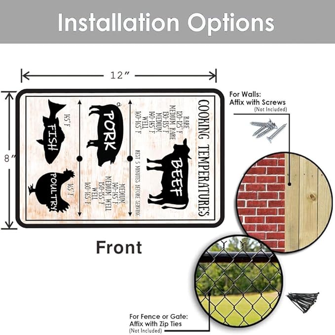 - Kitchen Tin Sign Easy To Hang: Funny Metal Tin Sign Cooking Temperatures Sign Decorations. Each Comes With 4 Pre-Drilled Holes So You Can Install Them Right Away. Just Nail It, Stick It With A Command Bar, Or Hang It With A String (Installation Tools Not Included). Plus, Rolled Edges And Rounded Corners Keep You Safe. These Signs Are Sure To Add Character And Style