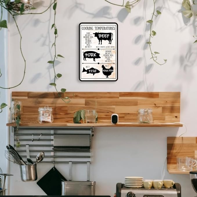 - Funny Kitchen Decor Vintage Metal Tin Sign Size: 8x12 Inches (20x30 Cm). You Will Receive 1 Be printed Cooking Temperatures Sign Simple And Elegant, And A Humorous Design That Will Bring Laughter To You And Your Friends And Loved Ones