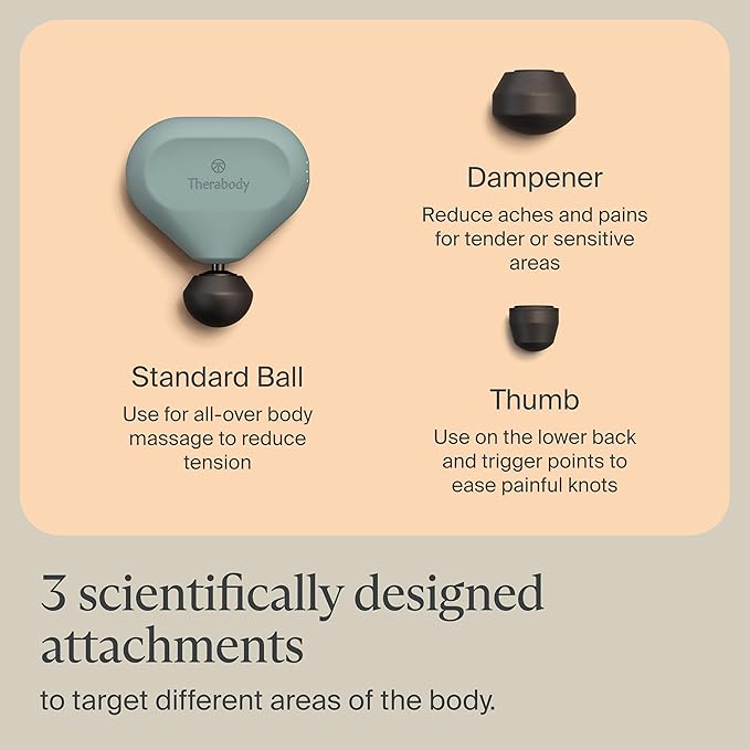 - Includes 3 high-quality, scientifically-designed attachments to target aches, pains, and tension all over the body: The Dampener reduces aches and pains in tender or sensitive areas, the Standard Ball offers full-body massage to reduce tension, and the Thumb is for use on lower back muscles and trigger points to ease painful knots.
