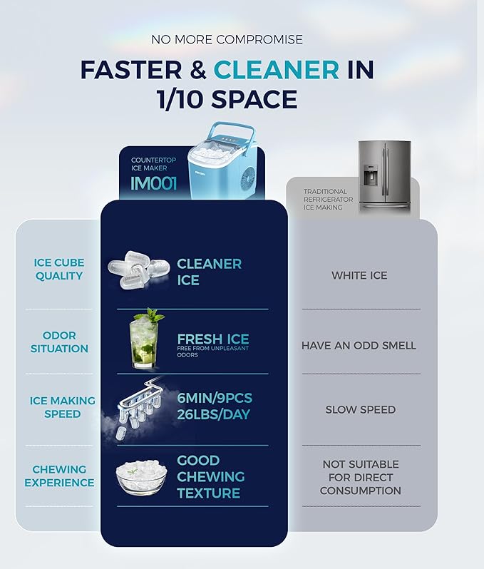 - 6 Mins Ice-Making & Ultra Quieter: Our Euhomy ice maker only takes 6mins that will enjoy the first batch of fresh bullet ice. With a 1.2L water tank and powerful compressor, the portable ice maker easily makes maximum ice capacity to 26lbs ice per day and holds up to 1.3lbs ice at a time. Also, our ice maker is not only excellent in refrigeration, but also at less than 45db normal noise, ensuring a comfortable and quiet environment to enjoy ice-making, similar to a working freezer