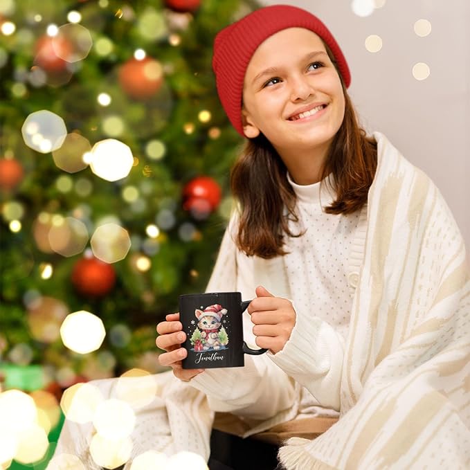 - 💝 UNIQUE DESIGN MUG: Delight a cat lover with this "Cute Christmas Cat Cup" featuring an adorable cat in a Santa hat surrounded by festive trees and a gift. Click "Customize Now" to add a name, making it a charming holiday gift for friends and family. This black ceramic mug is great for enjoying warm beverages during the Christmas season.