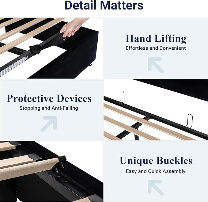 - Space-Saving Storage: With its lifting up storage feature, this bed frame provides ample space to store extra bedding, clothing, shoes, and other items, especially helpful for smaller bedrooms or apartments where storage space is limited
