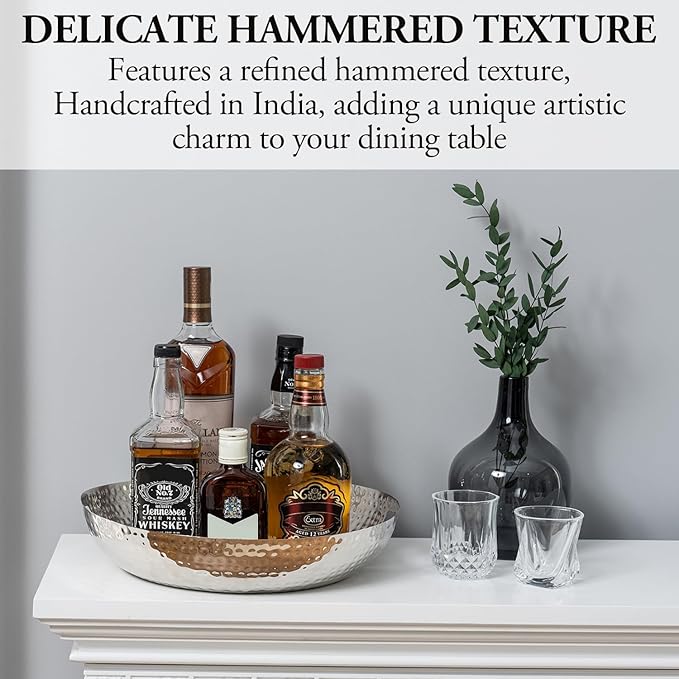 - 14-inch-round deluxe silver-toned hammered aluminum decorative dish with cutout handles serves food or displays items in timeless elegance **Proudly Handcrafted in India**