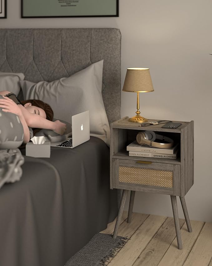 Rattan Nightstand,Modern Bedside Table with Storage Drawer and Open Wood Shelf, for Living Room, Bedroom and Small Spaces, Accent Night Stand with Solid Wood Legs, Easy Assembly(Grey Oak)