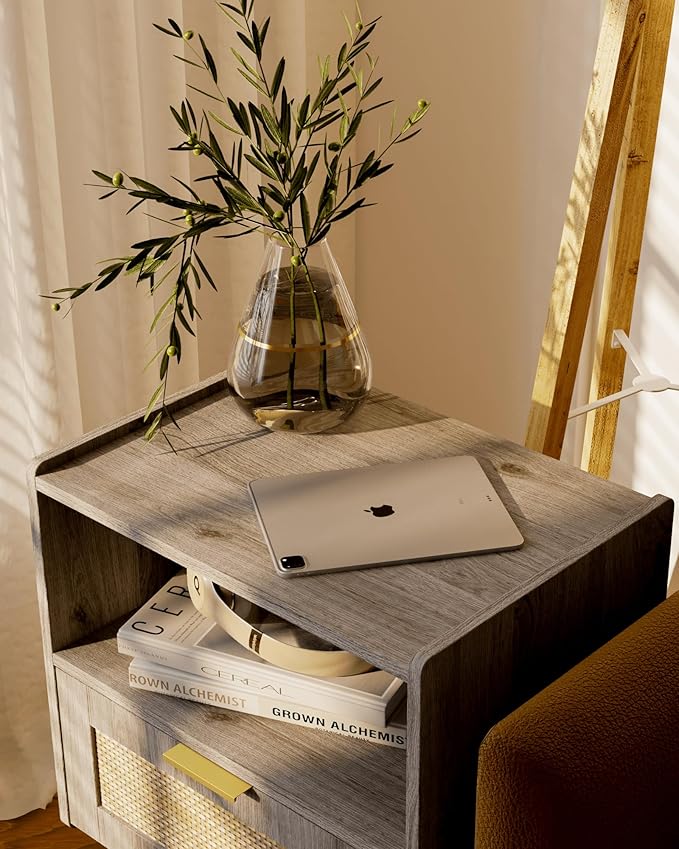 - Embrace an Modern Vibe:Grey Oak with rattan face,this nightstand emits an farmhouse vibe in your bedroom. It can also catch eyes as a side table or end table throughout the home,adding elegance to home life.