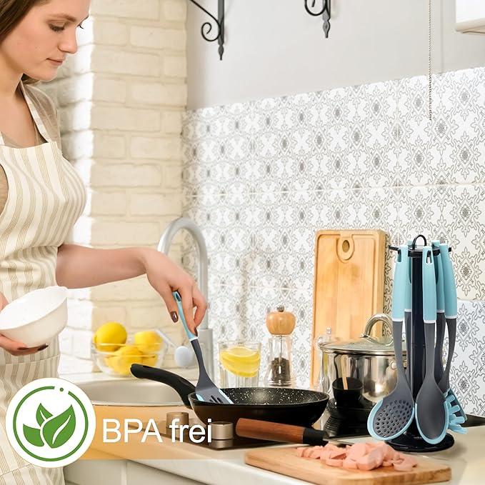 6-Piece Silicone Kitchen Utensil Set with Rotating Stand, Non-Stick, Heat-Resistant (400°F), Nylon Handle, Cooking Spatula Set for Baking & Cooking, Light Blue