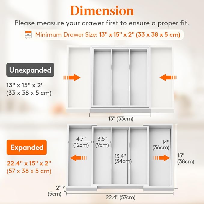 - Expandable Design: Expandable from 3 to 5 slots, measures 13" x 15" x 2" (33 x 38 x 5 cm) when folded and expands to 22.4" x 15" x 2" (57 x 38 x 5 cm); fitting drawers 13'' to 22.4''(33-57 cm) wide