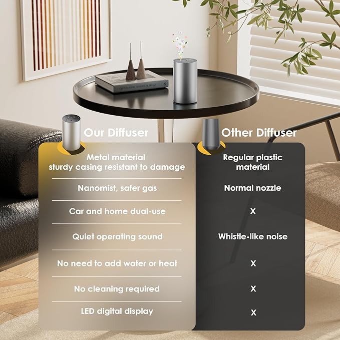 - Wide Coverage & Compact and Efficient: The Diffuser for Essential Oils can cover an area of up to 800 sq. ft and operates efficiently in large spaces. It effectively eliminates and masks unpleasant odors in areas such as pet rooms and bathrooms. Note: Please do not turn the Car Air Freshener Diffuser upside down to avoid leakage; this design feature enhances fragrance evaporation.