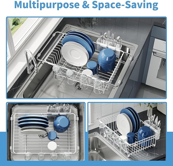 - Adjustable Supporting Bars: The supporting bars of the sink drying rack can be extended from 15.5" to 23.2", This dish rack is a great space saver that fits over most sinks. (NOTE: Please check if the size of your sink and the dish rack match before purchasing.)