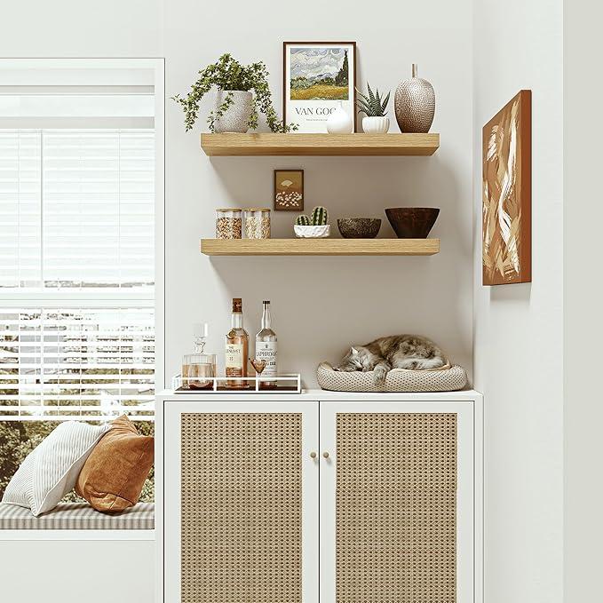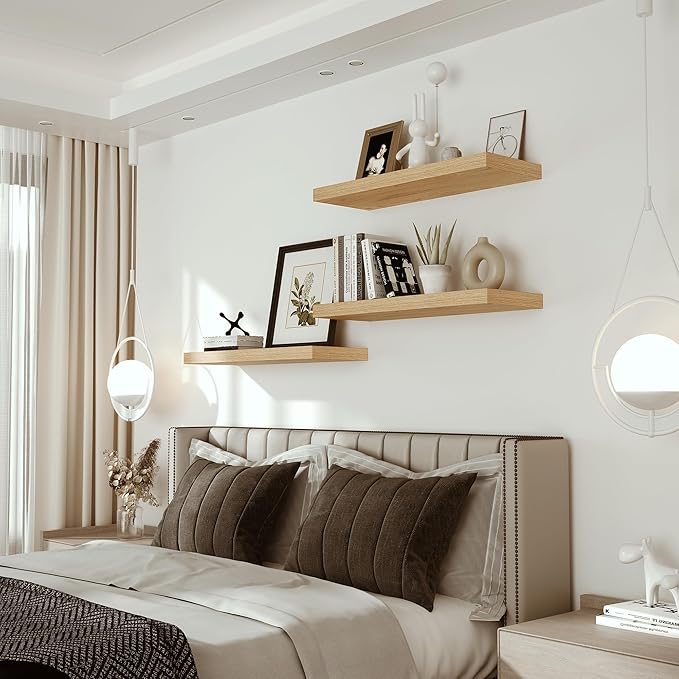 - Well-designed Floating Shelves - The rustic style floating shelves combining both practicality and style. These shelves offer a generous deeper and thicker surface, perfect for organizing daily sundries without taking up valuable floor space. The various of selected colours finish adds a cozy, natural element,display your art pieces on the wall to decorate your home, and make it full of aesthetic flare.