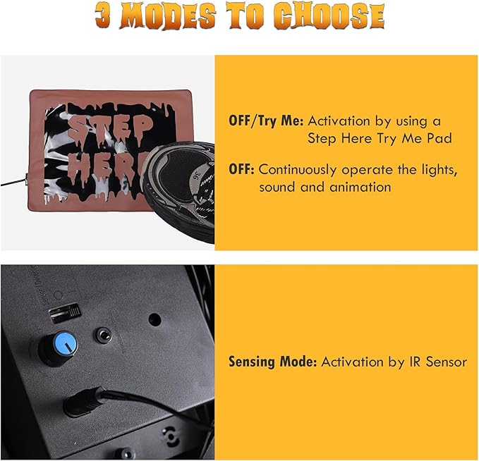 - 3 Activation Modes - Comes with a control box providing 3-mode control including Sensing Mode, Try Me, and ON, you can switch to ON to continuously operate the lights, sound, and animation, choose Try Me for foot pedal control, and Sensing Mode to activate IR sensor