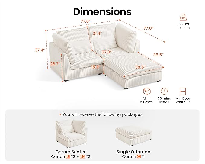 - 【Shipped in Five Packages for Easy Setup】To enhance your convenience, the sectional will be delivered in five packages, allowing for easier handling and assembly. Each package is carefully packed to ensure safety during transit, and while they may arrive at different days, rest assured that our professional customer service is ready to assist you with any concern. The thoughtful design makes the setup process simpler and more efficient,ensuring you enjoy your sectional without any hassle