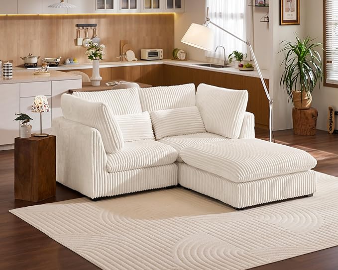 Oversized Modular Sofa, Extra Deep Cloud Corduroy Sectional Couch with Ottoman Chaise, Fluffy Chenille Loveseat L Sofa for Living Room, Villa (Loveseat+Ottoman, Corduroy White)