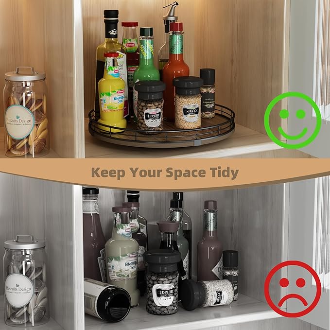 - 360°Smooth Rotation - The lazy susan turntable rotates smoothly and silently, placed next to the stove for easy access to condiments, spices, olive oil and cooking supplies. Placed next to the sink to display soap lotion. Thoughtful kitchen countertop organizers to rid your life of clutter!