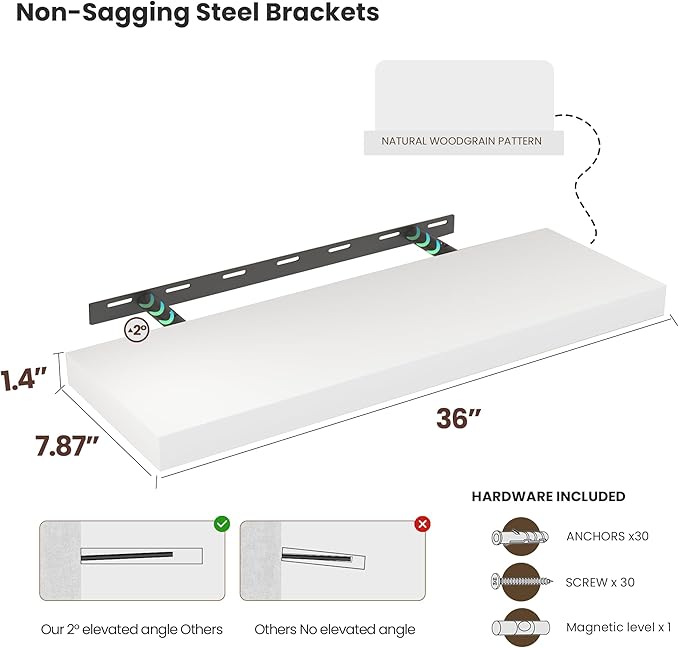 - Premium Wooden Floating Shelves -Unlike others, they are beautifully-finished, fantastic-smelling solid pine,and they are handcrafted out of finest solid pine wood measuring 36" x 8" x 1.38",revealing its own character of knots and natural wood grain, making each ledge a little different but equally stunning.
