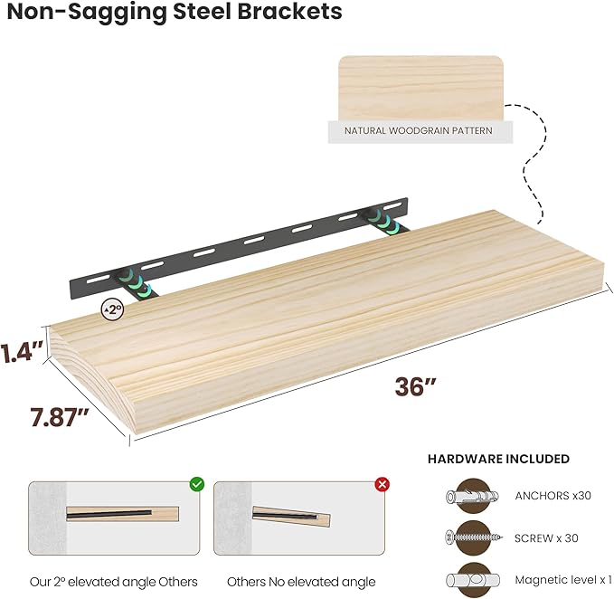 - Premium Wooden Floating Shelves -Unlike others, they are beautifully-finished, fantastic-smelling solid pine,and they are handcrafted out of finest solid pine wood measuring 36" x 8" x 1.38",revealing its own character of knots and natural wood grain, making each ledge a little different but equally stunning.