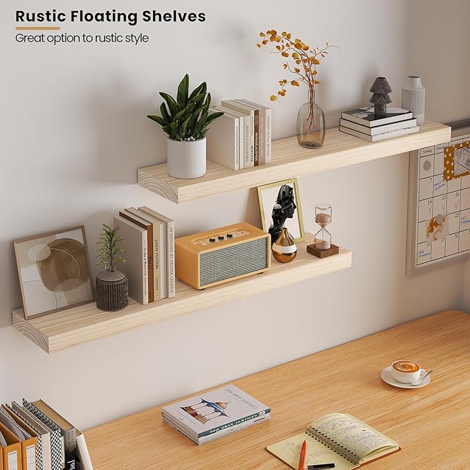 Light Wood Floating Shelves 36”x 8”x 1.4” Book Shelf Floating for Wall Mounted, Heavy Duty Shelf Hold 80 lbs, Unfinished Rustic Wall Shelves for Bedroom, Living Room, Kitchen, Office, Laundry Room