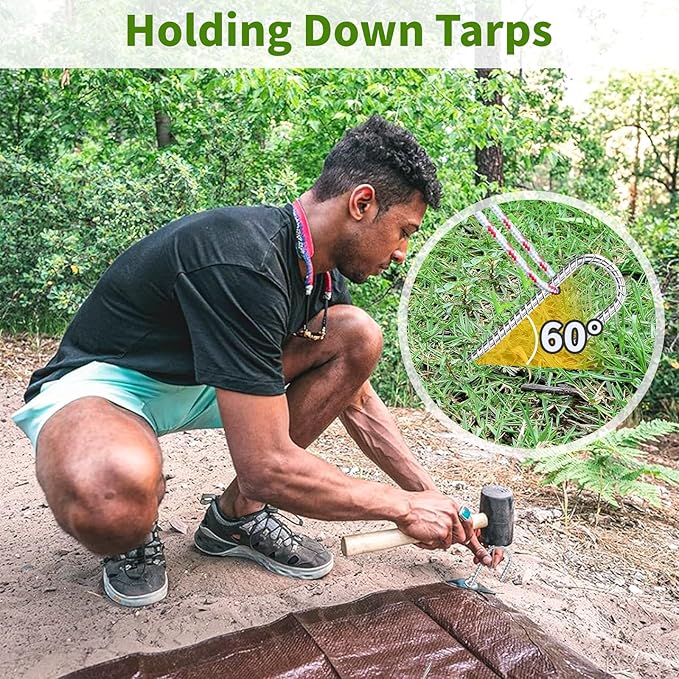 - 【Sharp Tips】The j hook stakes have a chiseled end to facilitate ground penetration, the metal steel is sturdy and does not deform when hammered into tough ground. These ground stakes are thick and heavy duty and they will not budge in a strong wind.