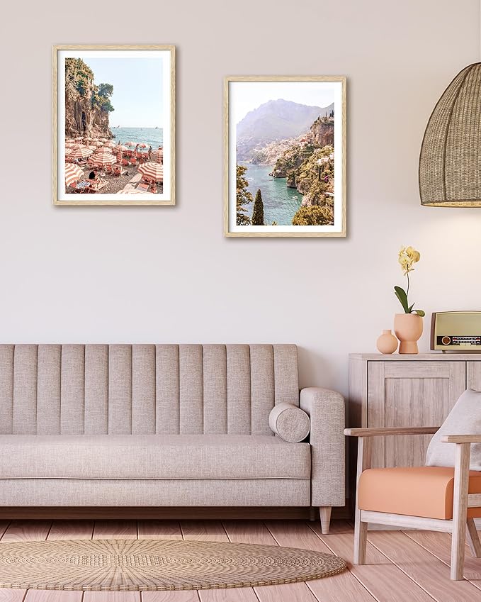 HesenDot Natural OAK Wood Framed Summer in Positano Wall Art,12x16in Italy Amalfi Coastal Canvas Wall Print,Arienzo Beach Umbrellas Poster Wall Decor for Living Room,Bedroom,Office Gallery Set of 1