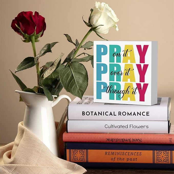 Office Decor for Women Christian Gifts Desk Bedroom Bible Verse Wall Art Inspirational Wooden Box - Pray on It Over It Through It