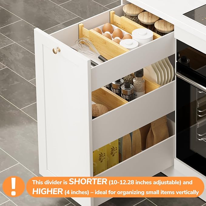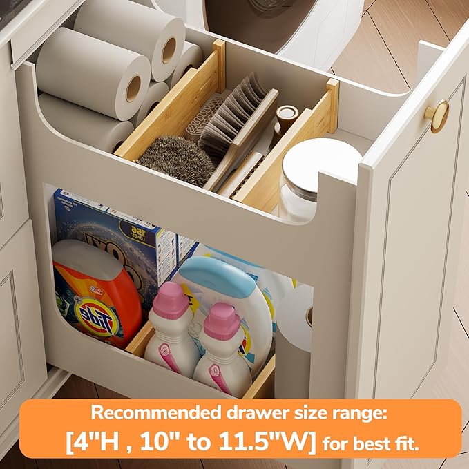 - Expandable design: Each deep drawer divider is 4" H, 0.6"W, and 10" to 12.28"L, which can be adjusted according to the size of the drawer, adapting to different furniture needs. Fits at least 4"H & 10-11.5"W drawers. Do not overstretchβmay reduce elasticity if extended beyond recommended length.