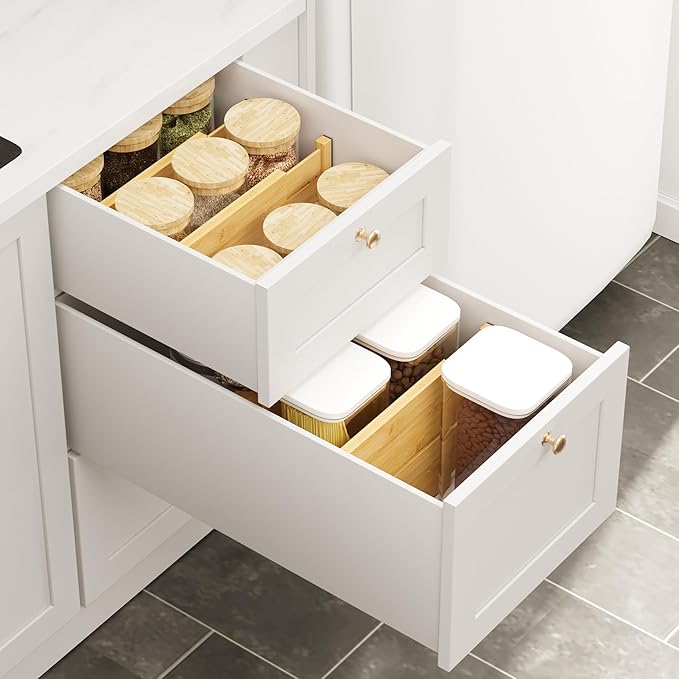- No Need to Install: This kitchen drawer dividers have a built-in spring structure that eliminate the need for tedious installation steps; Simply push it gently and squeeze both sides inward, the pin comes off instantly and is ready for use