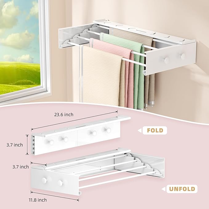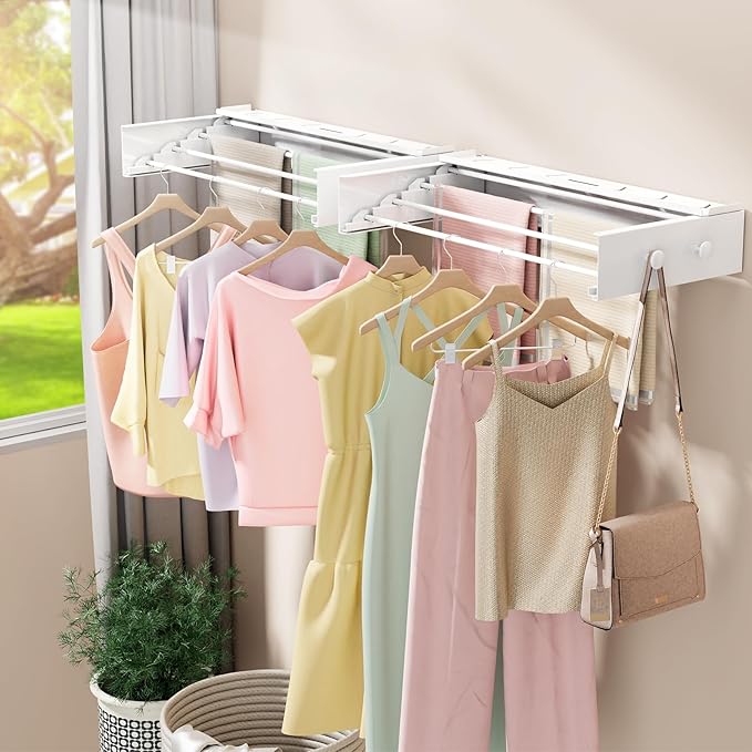 - Upgrade Drying Racks & Space Saver: 4 convenient Knob Hooks attached on wall mounted drying racks make it easy to retract, allowing you to hang clothes, towels, ties or extra stuff even when folded. Upgrade smoothness and quietness when retracting and opening. Upgrade the stability of poles, so the rods on it never spin with wet laundry loaded. laundry drying rack folds flat against the wall, really save space when not in use.