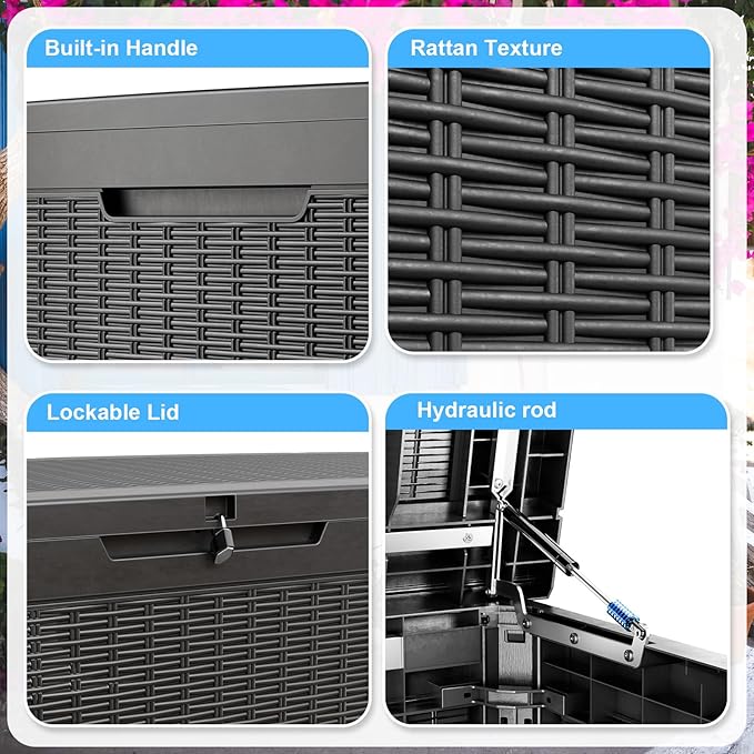 - Safety Design: Each deck box has lockable holes (not included) for added security; in addition, the box is equipped with a hydraulic stand, which allows easy opening and slow closing and prevents hand pinching. The outdoor waterproof deck box has built-in handles on both sides, ensuring easy grabbing and moving.