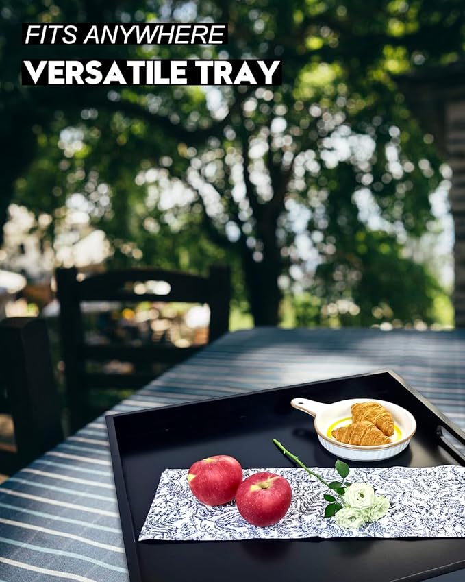 - STYLISH & ELEGANT - With its silky black appearance, this large tray is a great accent piece for any space. Not only does it serve as an ottoman tray for living room, but it also makes a beautiful display on your coffee table, kitchen countertop, or bed bench.