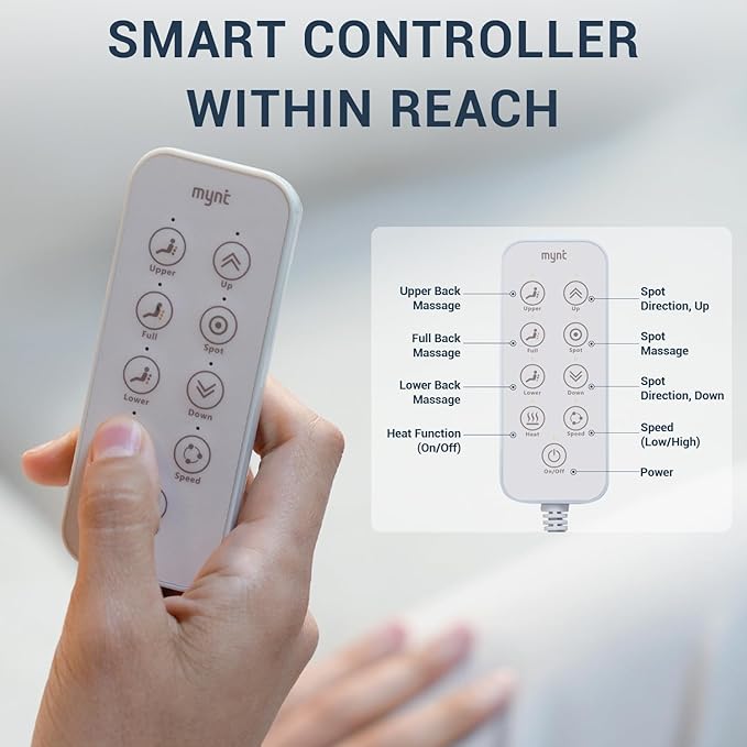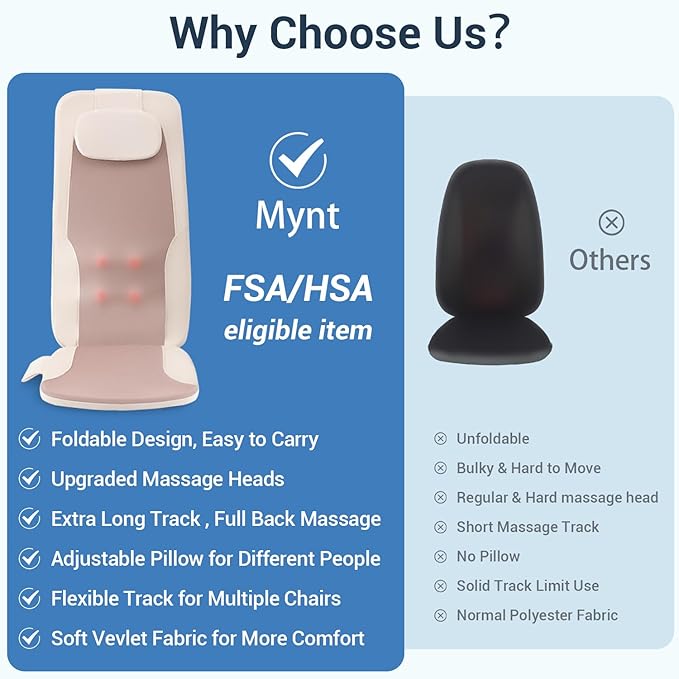 Mynt FSA HSA Eligible Foldable Back Massager, Chair Massager with Soothing Heat, Flexible Massage Chair Pad with Soft S-Curve Longer Track Adjustable Pillow for Diverse Body Contours, FSA/HSA Approved