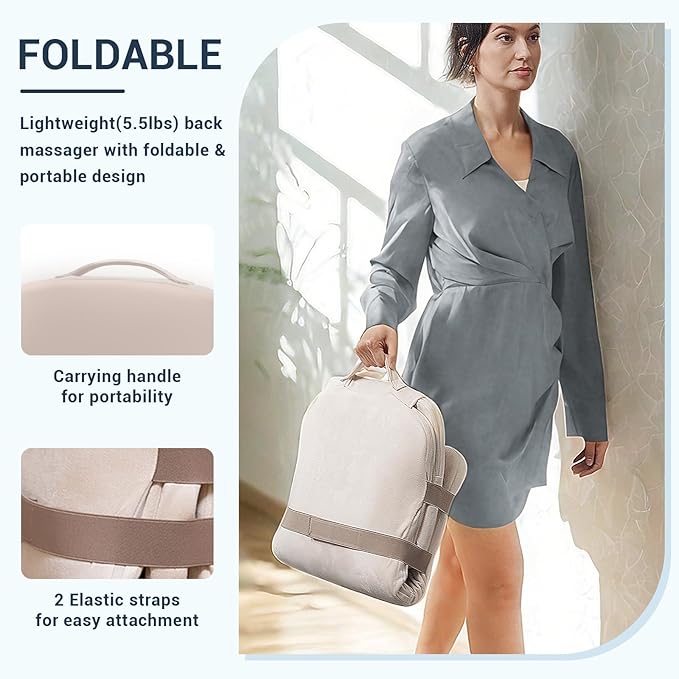 - Foldable Back Massager: This FSA/HSA eligible lightweight (5.5 lbs) back massager features a foldable design with 2 elastic straps for easy attachment and a carrying handle for portability, making it perfect for use at home/office and convenient to carry, ideal gift for your mother wife friends. If you live in an apartment without space for an actual massage chair, this will works really great