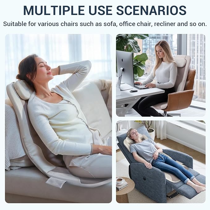 - Full Back Massage Seat Cushion: This FSA back massager eligible items only is designed with a 22.45-inch track (4.74 inches longer than most models), covers your entire back from top to bottom. The adjustable pillow accommodates different body types, heights, and chair types for personalized comfort. Whether you want to relieve fatigue in an office chair or your mother wants to relax in a recliner at home, this massager pad will offers a reliable and soothing experience (Tip: Add a pillow between the cushion and sofa for extra support.)