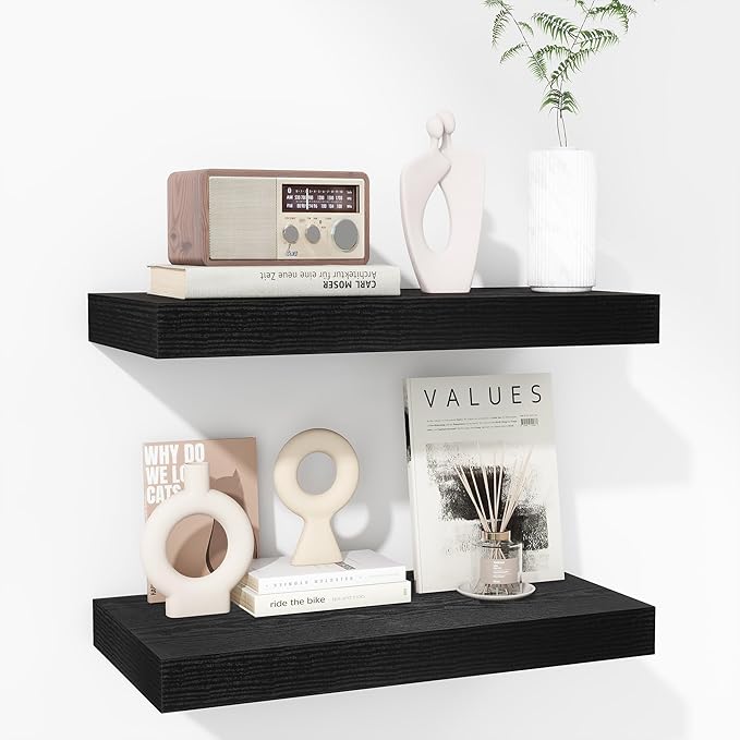 - Rustic & Modern Wooden Floating Shelves: Crafted from durable engineered wood with a realistic wood grain finish, our floating shelves offer the perfect blend of rustic charm and modern minimalism. The matte surface enhances its sleek, contemporary look, making it ideal for any room in your home. Whether you want to display your collection or organize essentials, these wall shelves seamlessly integrate with any décor and can be mounted on any wall to elevate your living space.