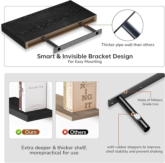 - Extra Deeper & Thicker - Each board measures 16"W x 8"D x 1.5"H. Extra deeper and thicker design in order to bring maximizes storage space and weight capacity, even hold up to 30 lb each. This floating shelf taking up zero square feet, reduces clutter and highlights décor in compact spaces.
