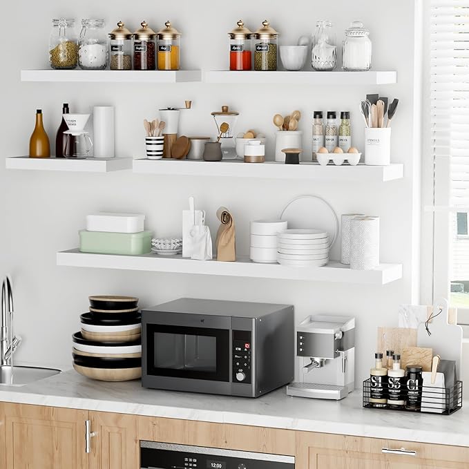 - Versatile & Multi-Scene Functionality: Our floating shelves are available in a variety of sizes and thicknesses, allowing you to choose the perfect fit for your space. Use them in the bathroom to store beauty products, hair care items. In the bedroom, they can hold books, cosmetics, and personal items. In the kitchen, they’re perfect for spices, jars, or small utensils. Or display photo frames, trophies, or collections in the living room. These shelves efficiently use wall space to create a tidier, more spacious feel in any room.