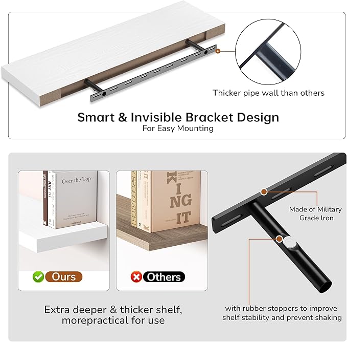 - Extra Deeper & Thicker - Each board measures 36"W x 8"D x 1.8"H. Extra deeper and thicker design in order to bring maximizes storage space and weight capacity, even hold up to 70 lb each. This floating shelf taking up zero square feet, reduces clutter and highlights décor in compact spaces.
