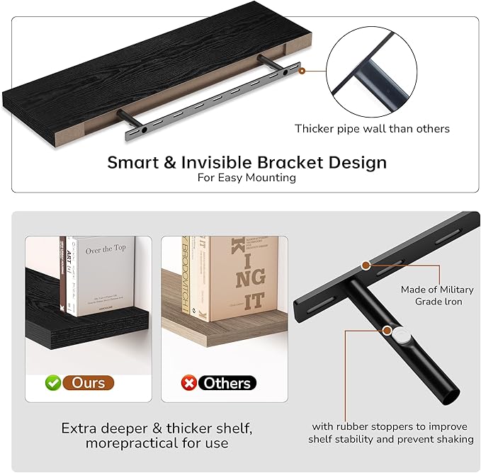 - Extra Deeper & Thicker - Each board measures 36"W x 8"D x 1.8"H. Extra deeper and thicker design in order to bring maximizes storage space and weight capacity, even hold up to 70 lb each. This floating shelf taking up zero square feet, reduces clutter and highlights décor in compact spaces.