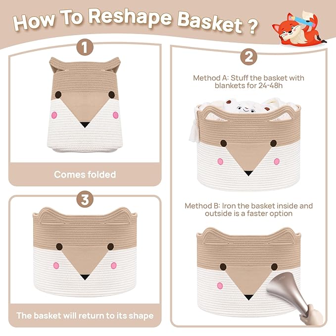 - 【Note】The baby blanket baskets arrive folded, but please don’t worry—this is not a quality issue. You can check out the videos we uploaded. Fill it with blankets and quilt in 24 to 48 hours to make it look round. Then iron the creased places inside and outside the basket. It'll get back to its best shape. This is a basket you’ll use for years. We’ve put a lot of care and love into designing these baskets, and you can trust the quality and craftsmanship.