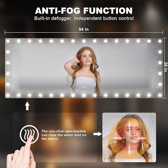- 【Hollywood Design with Full Illumination】This modern bathroom mirror features a 94" x 36" HD glass mirror with a Hollywood-style design and 38 LED bulbs, delivering even, shadow-free lighting. Its frameless design and elegant Hollywood aesthetic bring style and functionality to any luxurious bathroom décor.