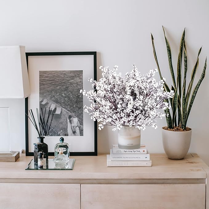 - [PREMIUM MATERIAL]: The babys breath artificial flowers are made of environmentally friendly plastic and silk, wire wrapped with plastics is used for firmness and angle-adjustable in creating the stems.